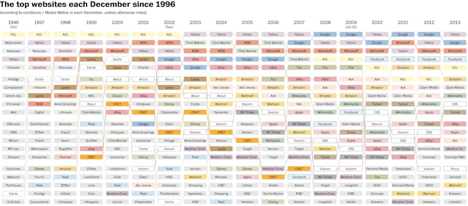 1996-2013年の間で、最も人気のある20のウェブサイトを追跡