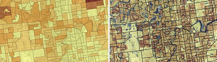 フロリダ州タンパにおけるコロプレス・マップ(左)とディシメトリック・マップ(右)の比較