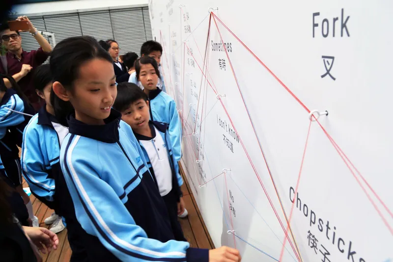 写真に写っている壁面は、その仕組みを巨大なパネルとして展示した例で、見出しにある「SPOON VS. FORK(スプーン派かフォーク派か)」が起点の問いになっています。以降、属性(出身地・性別・年齢・就業状況など)や身体特性(身長・利き手・体重など)の軸へと、一本の糸が“回答の経路”としてつながっていきます。