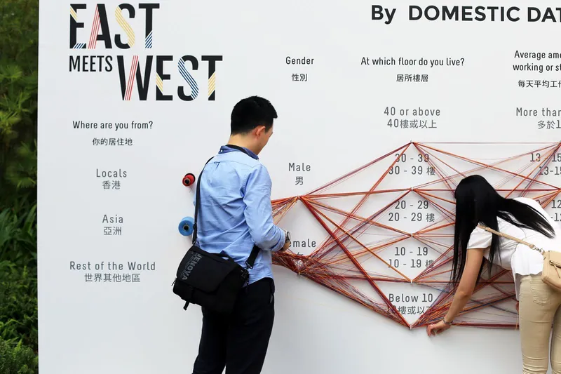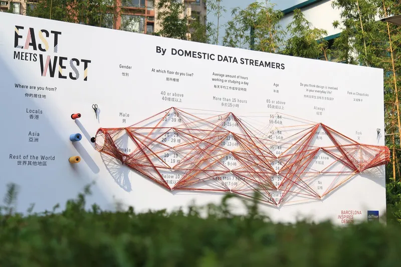 この作品は、来場者が質問に答えながら「糸(ストリング)」を選択肢に沿って渡していくことで、集団の回答傾向を“物理的な線の束”として可視化する参加型インスタレーションです。Domestic Data Streamers の公式説明では、参加者は複数の質問に対して選択肢の周りに糸を編むように通し、その積み重なりによって「集合的な思考や事実の可視化」が生成され、個人は自分の答えを全体像(bigger picture)と比較できる、とされています。