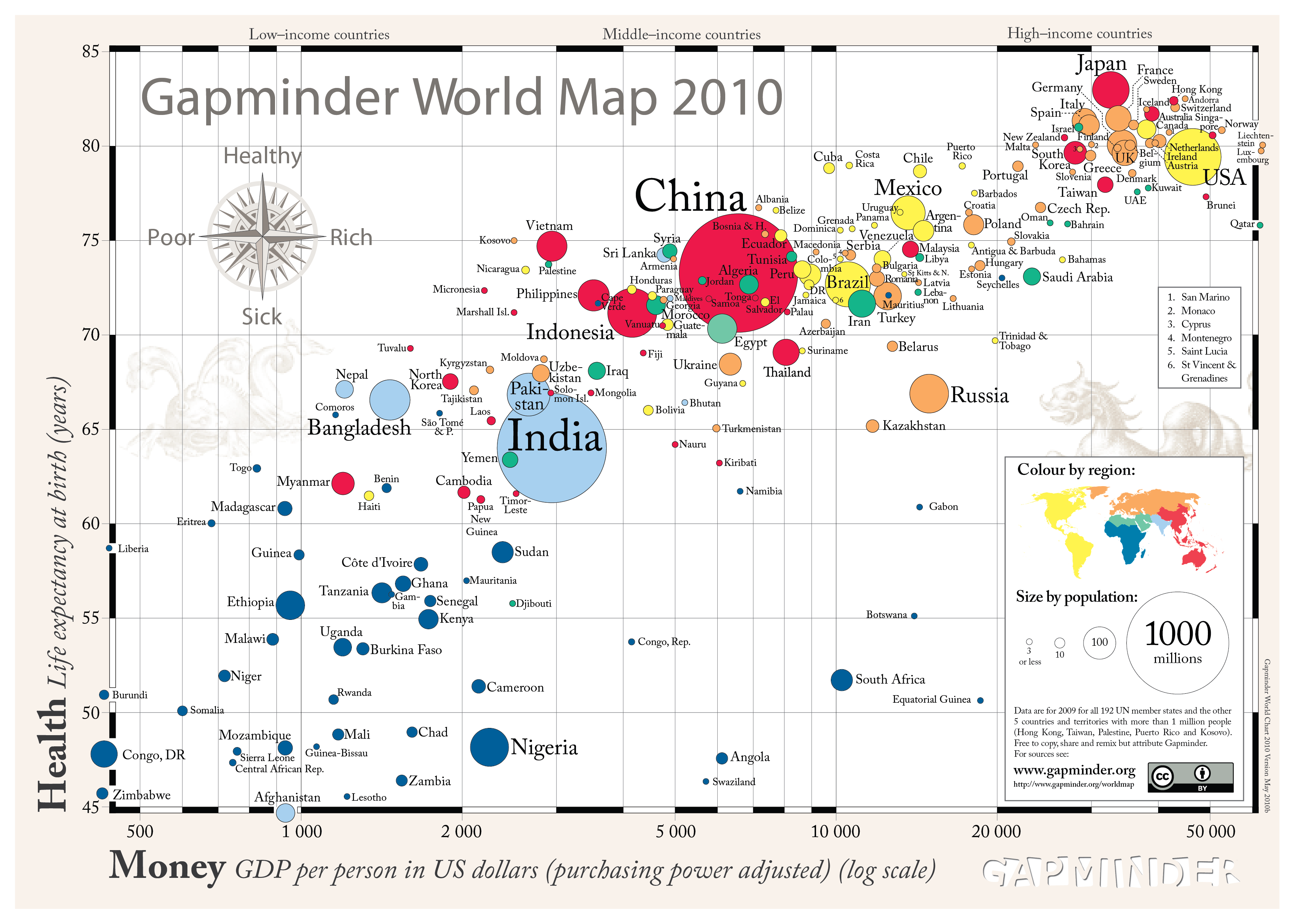「Gapminder World Map 2010」は、統計を単なる数字ではなく「動的なストーリー」として見せる代表的な可視化作品です。