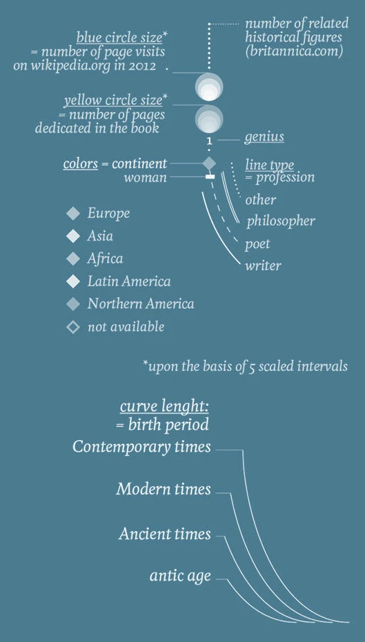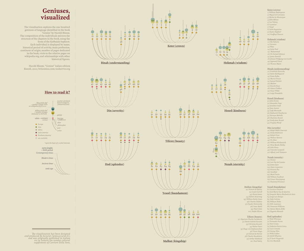 文芸批評家ハロルド・ブルームが著書『天才(Genius)』で取り上げた100人の「規範となる創造者」たちを題材にしたインフォグラフィック作品があります。2012年にイタリアの新聞『Corriere della Sera』の日曜版文化誌『La Lettura(ラ・レットゥラ)』に掲載され、後にBehanceにも公開された「Geniuses, visualized」です。