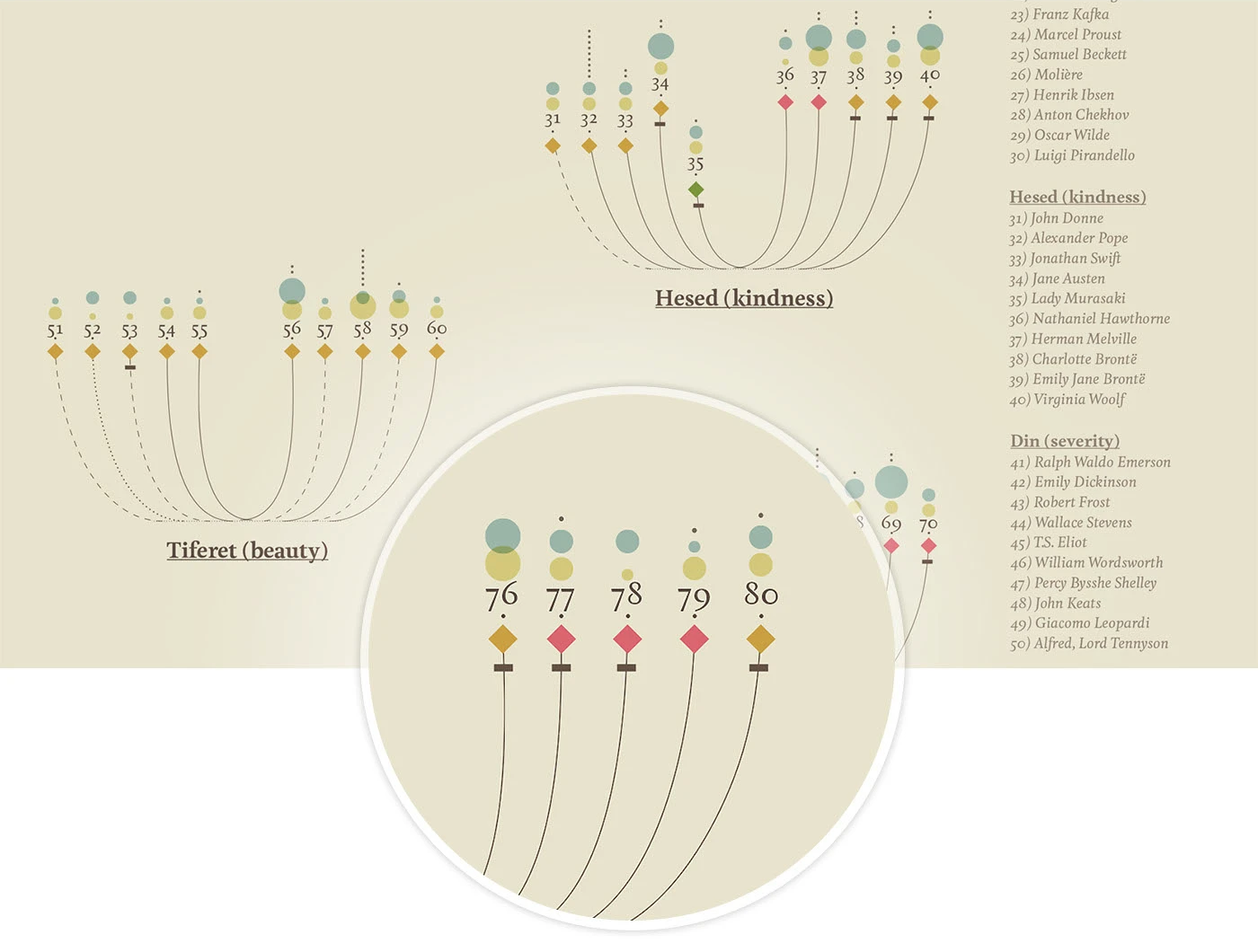 ブルームが選出した文学的天才たち -シェイクスピアからルイス・キャロルに至るまで- を、カバラ思想における「セフィロトの樹(Tree of Sephiroth)」に見立てて配置することで、知の宇宙的な秩序を示しています。単なる人名リストではなく、文化的な影響関係や文学史上の広がりを「体系」として視覚化した点が大きな特徴です。