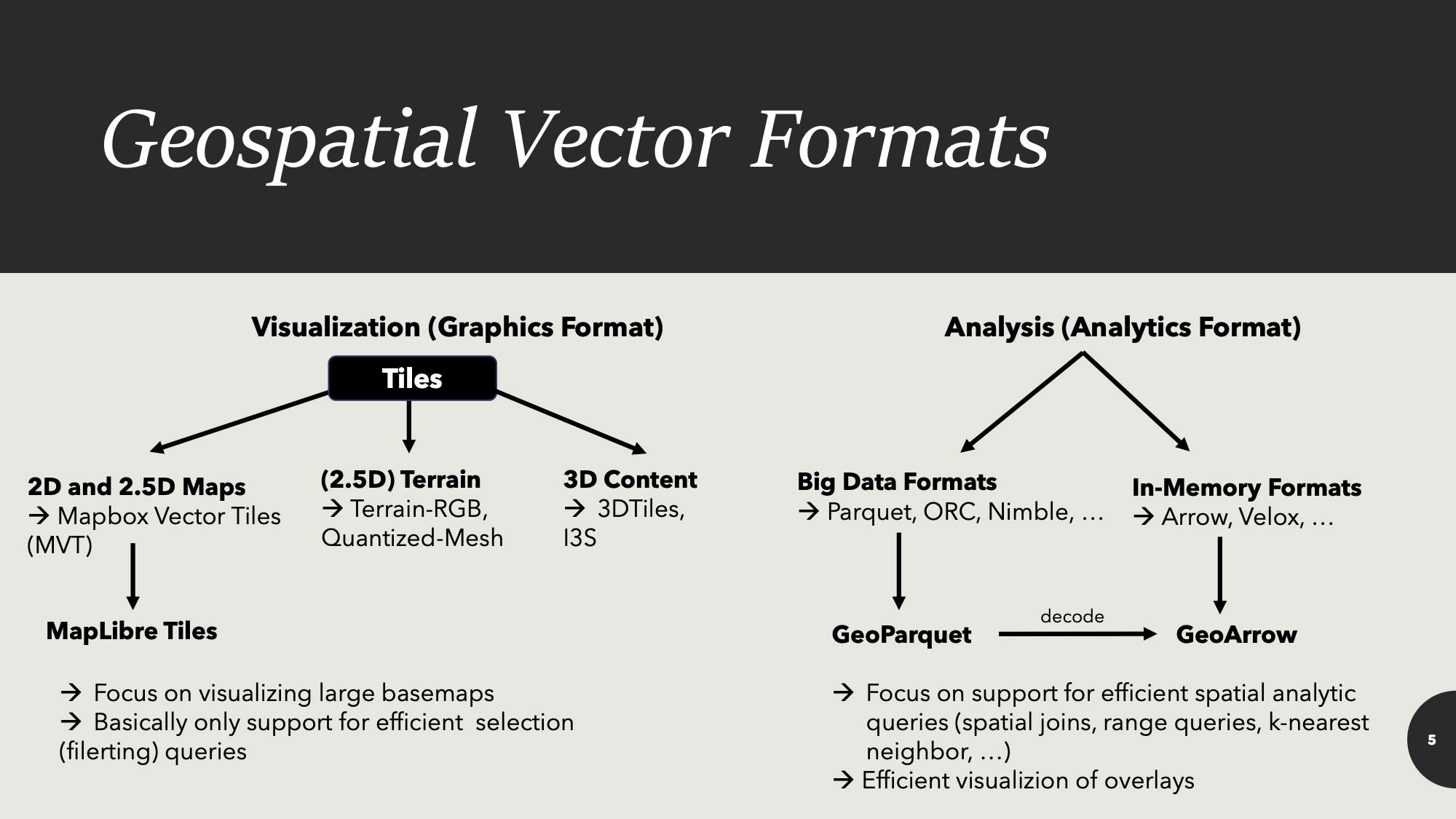ベクタタイルは、地図をタイル分割しつつ「画像」ではなく「地物データ」を配信する方式で、スタイルを動的に当てられることが強みです。その代表仕様であるMVTは広く普及しましたが、近年の巨大データ・GPU中心の描画モデルに対しては、形式の前提が古くなりつつあります。
