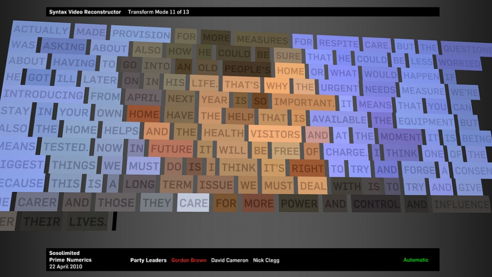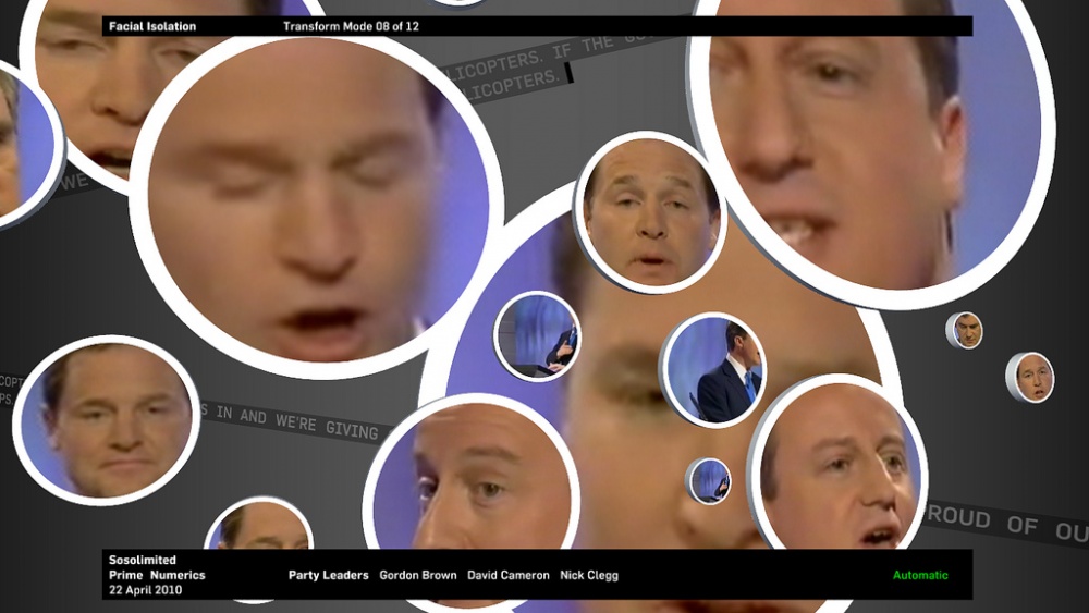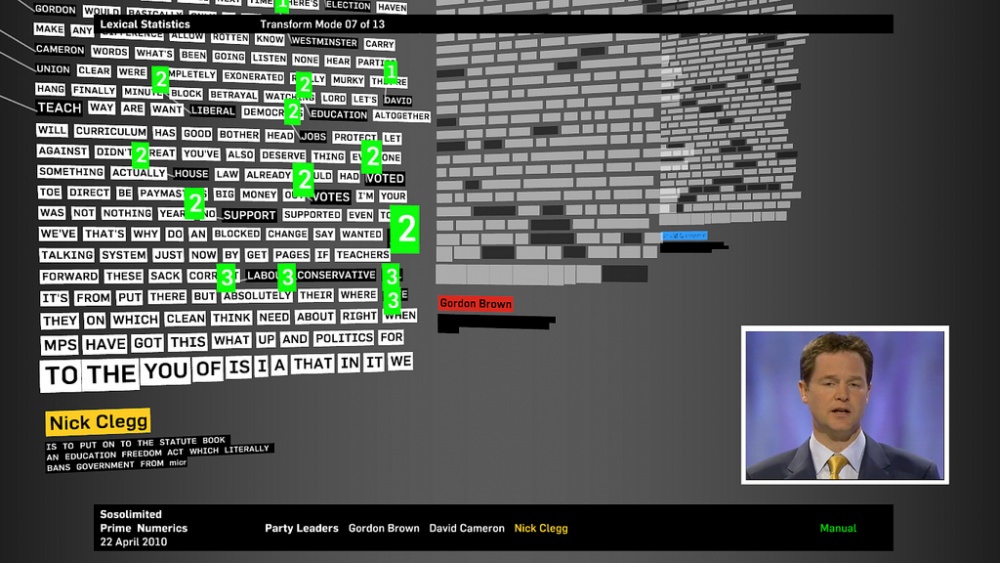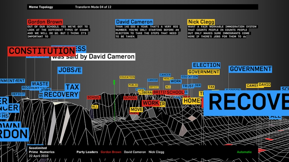 Prime Numerics(2010)は、イギリス総選挙におけるテレビ討論を対象に、政治家の発言をリアルタイムで解析・可視化したライブ・データビジュアライゼーション作品です。本作は、Eric Gunther、Justin Manor、John Rothenbergによる制作ユニット Sosolimited によって手がけられました。