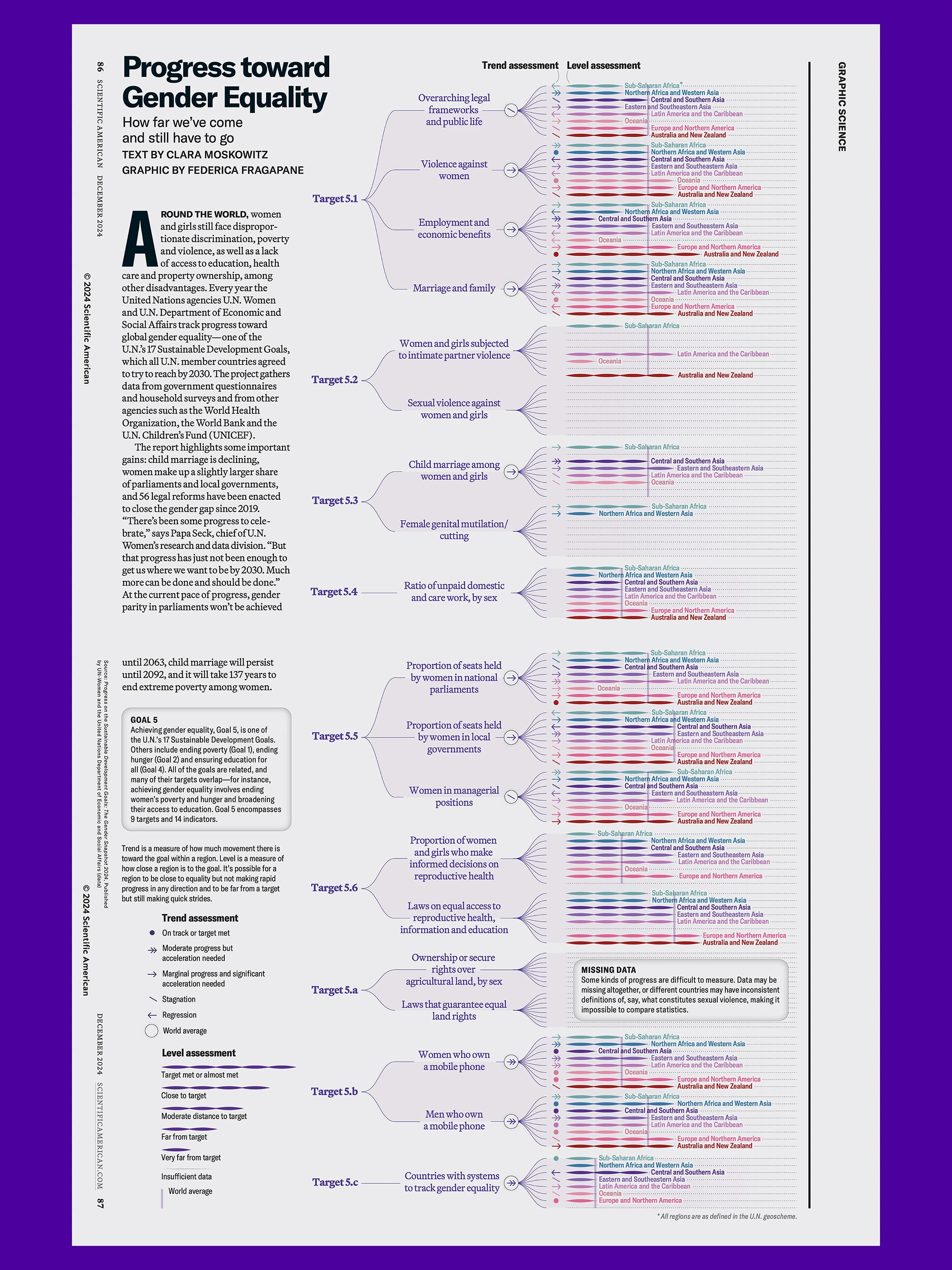 テキストは Clara Moskowitz によるもので、男女平等の現状と課題を科学誌読者向けに要約しています。