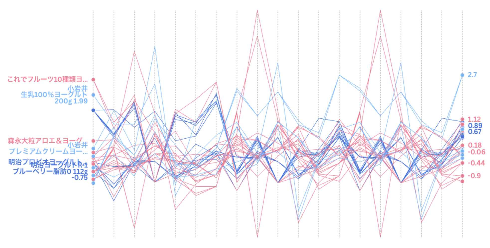 つまり、レーダー・チャートが放射方向に散らばる軸をもつのに対し、平行座標はすべての変数を縦に並べるため、「共通スケール上での比較」がやりやすいというわけです。