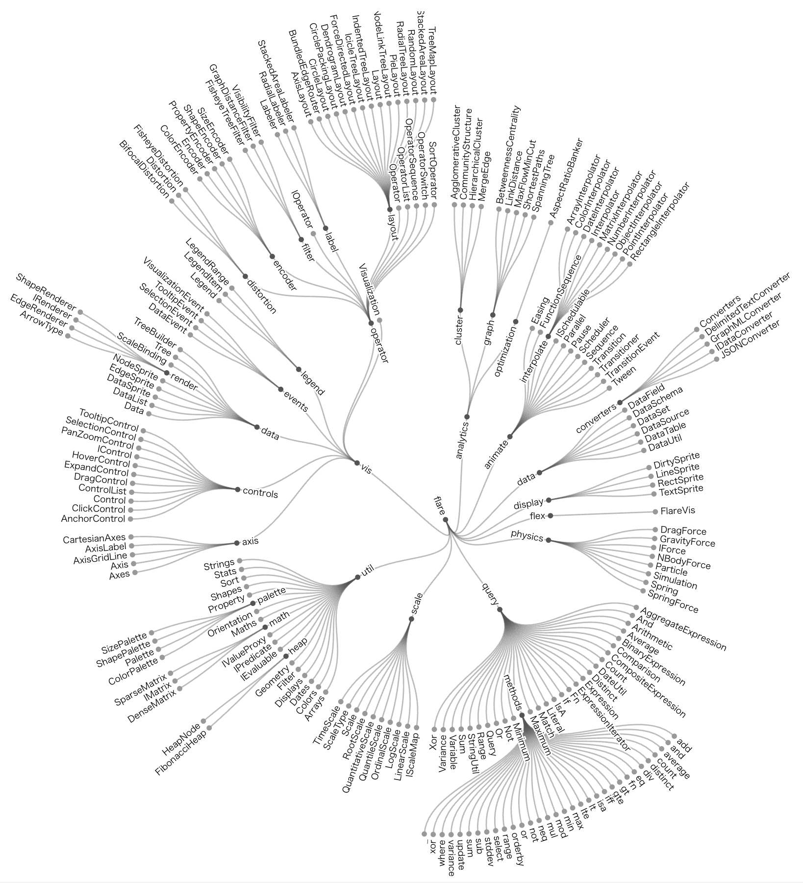 特に Tamara Munzner や Ben Shneiderman らの研究を通じて、ツリー構造の多様なレイアウト手法(矩形、円形、放射状など)が体系化されました。近年では、D3.js や RAWGraphs 、Gephi などの可視化ツールで簡単に放射樹レイアウトを生成できます。
