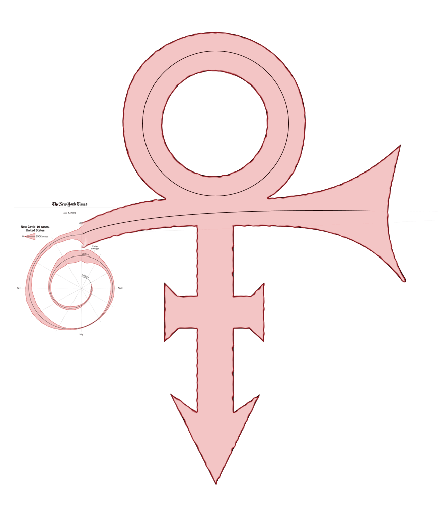 NYT のスパイラル図はその形状ゆえに、思わぬ派生作品も生まれました。 たとえばこちらは、アーティスト Prince が用いた記号「Love Symbol」を想起させるようにスパイラルを変形させたものです。