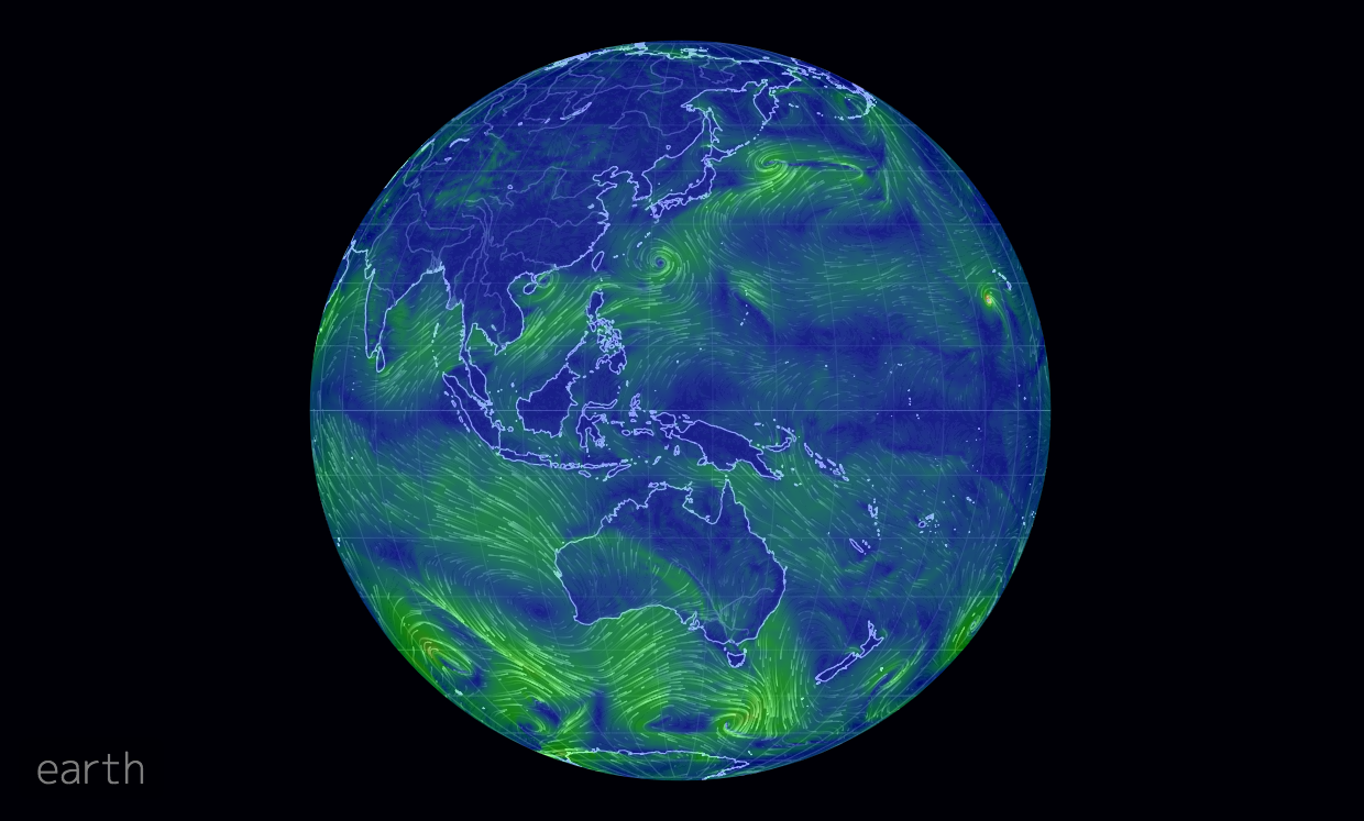 キャメロン・ベッカリオ(Cameron Beccario)による個人作品。”wind map”にインスピレーションを受けて制作されました。数時間ほどのタイムラグがあるデータを反映しており、様々なデータを、様々な地図投影法で可視化しています。